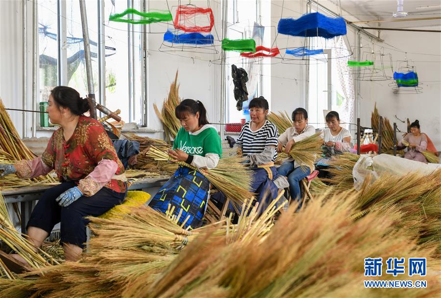 貧困戶在內蒙古赤峰市巴林左旗林東鎮扶貧車間內制作笤帚(2019年8月5日攝)。新華社記者 彭源 攝