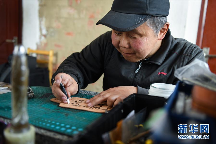 內蒙古鄂溫克族自治旗錫尼河鎮村平易近米格木爾在制作皮雕(2020年4月15台北汽車零件日攝)。新華社記者 劉磊 攝