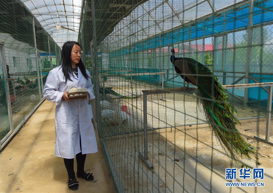 周海南在內蒙古興安盟烏蘭浩特市義勒力特鎮蒙雀養殖專業一起配合社照顧孔雀。養殖孔雀帶動貧困戶脫貧致富(2018年5月21日攝)。新華社記者 彭源 攝